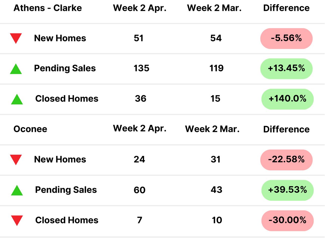 Insight: New home listings remained relatively stable in both Clarke and Oconee counties this month, suggesting consistent seller activity. However, pending sales rose in both counties, pointing to increased purchasing activity as we move further into the spring market. These trends suggest growing momentum among buyers, particularly in Clarke, while inventory levels hold steady.