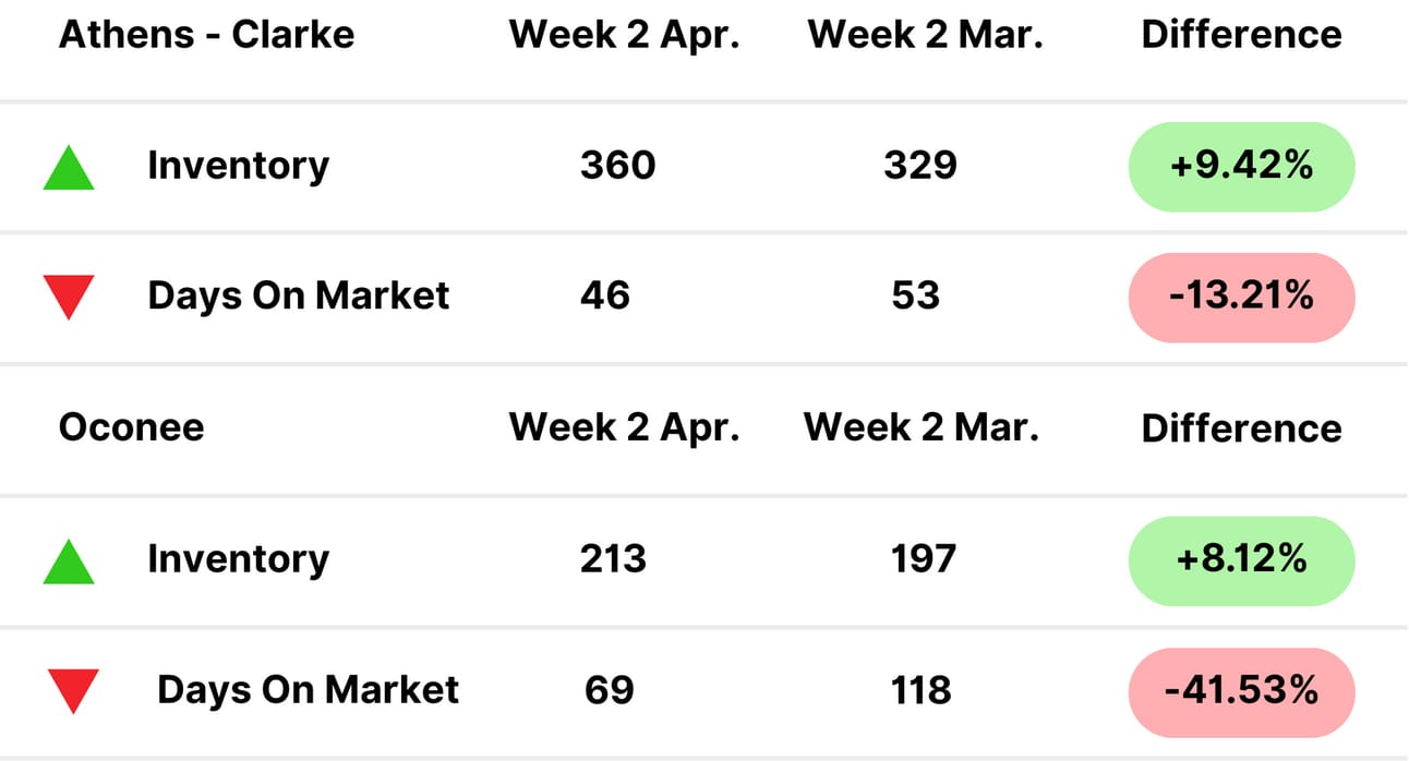 This spring is already showing signs of change in market dynamics. March brought a 10% year-over-year increase in new listings and a 28% rise in total active listings, according to recent housing data. This can be seen in the statistics of Athens above, which has seen an increase in both new listings and total active listings.